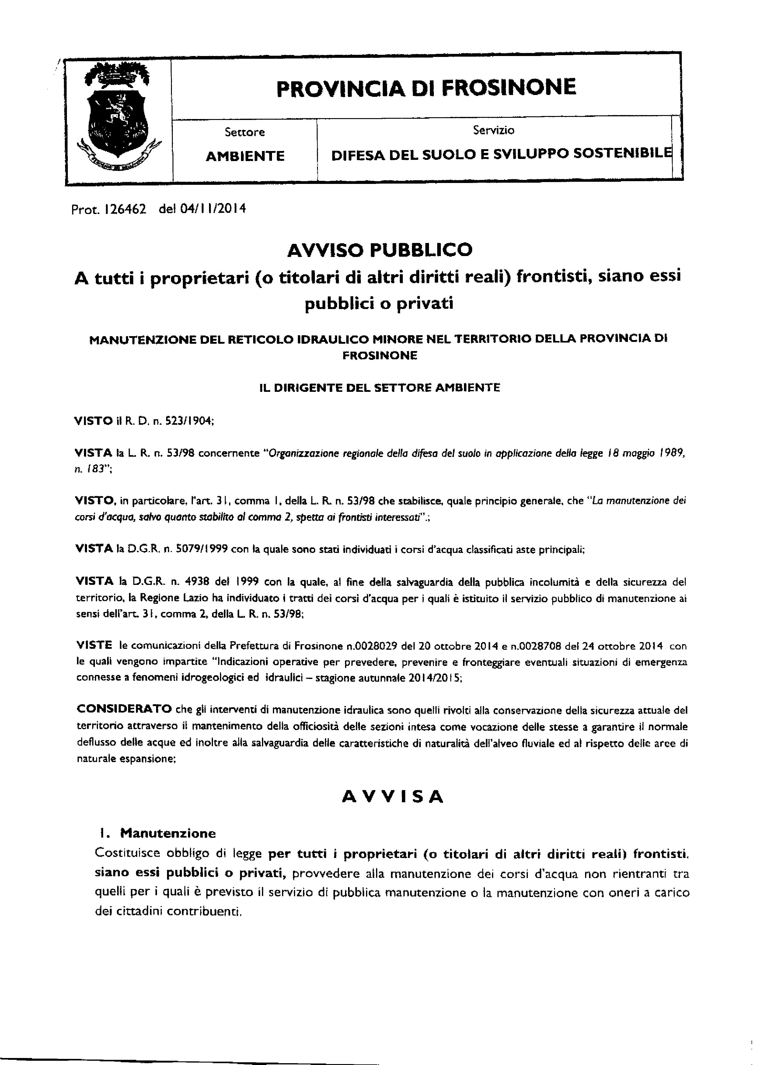 AVVISO PUBBLICO – A tutti i proprietari (o titolari di altri diritti reali) frontisti, siano essi pubblici o privati – MANUTENZIONE DEL RETICOLO IDRAULICO MINORE NEL TERRITORIO DELLA PROVINCIA DI FROSINONE