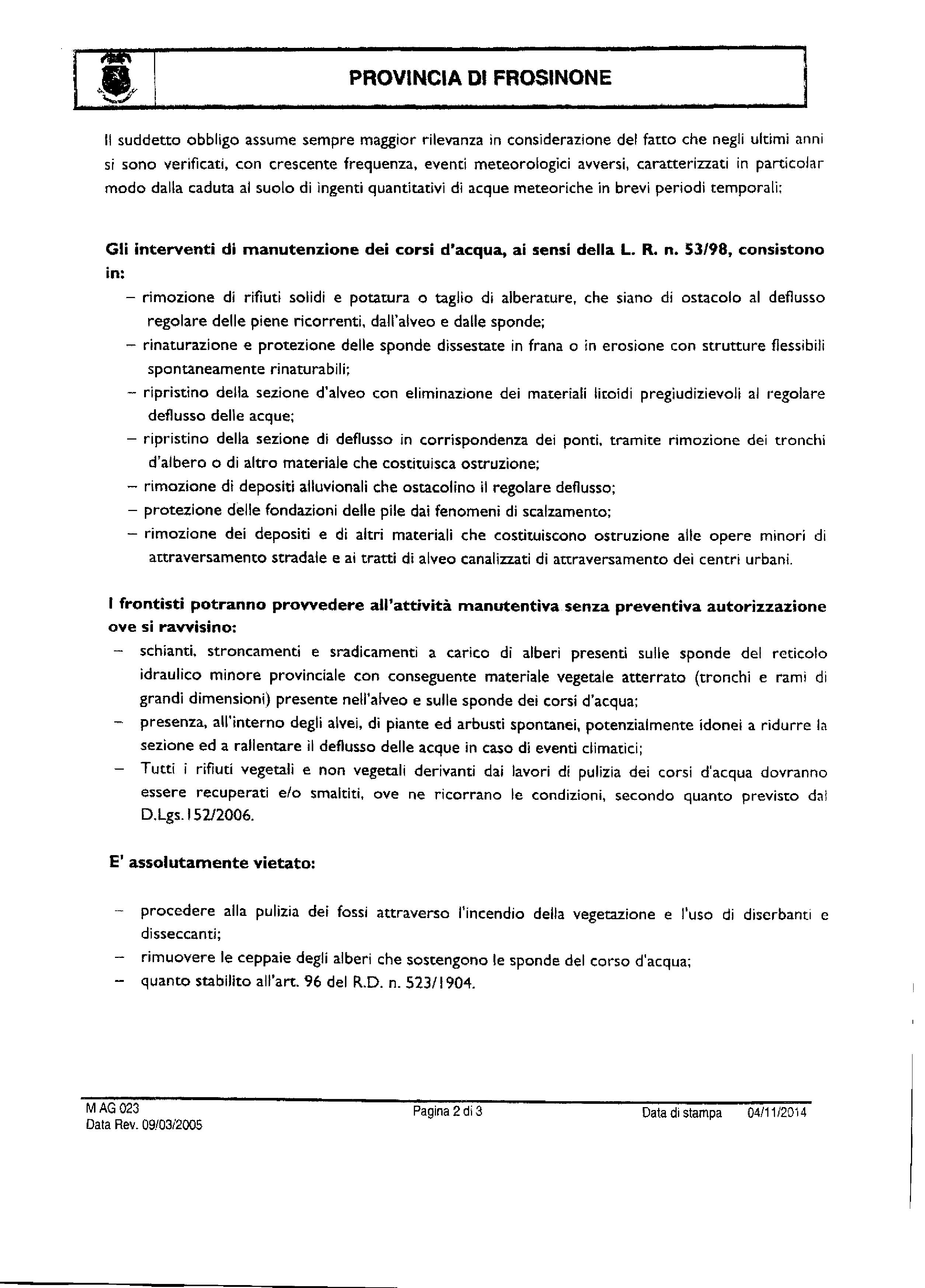 AVVISO PUBBLICO – A tutti i proprietari (o titolari di altri diritti reali) frontisti, siano essi pubblici o privati – MANUTENZIONE DEL RETICOLO IDRAULICO MINORE NEL TERRITORIO DELLA PROVINCIA DI FROSINONE