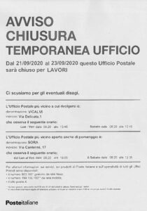 CHIUSURA UFFICIO POSTALE DI POSTA FIBRENO DA LUNEDI’ 21 A MERCOLEDI’ 23 SETTEMBRE 2020