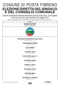 Lista dei candidati per l’elezione diretta alla carica di Sindaco e di n. 10 Consiglieri comunali che avrà luogo domenica 26 maggio 2019. – Lista n.1 “Posta Fibreno in Comune”