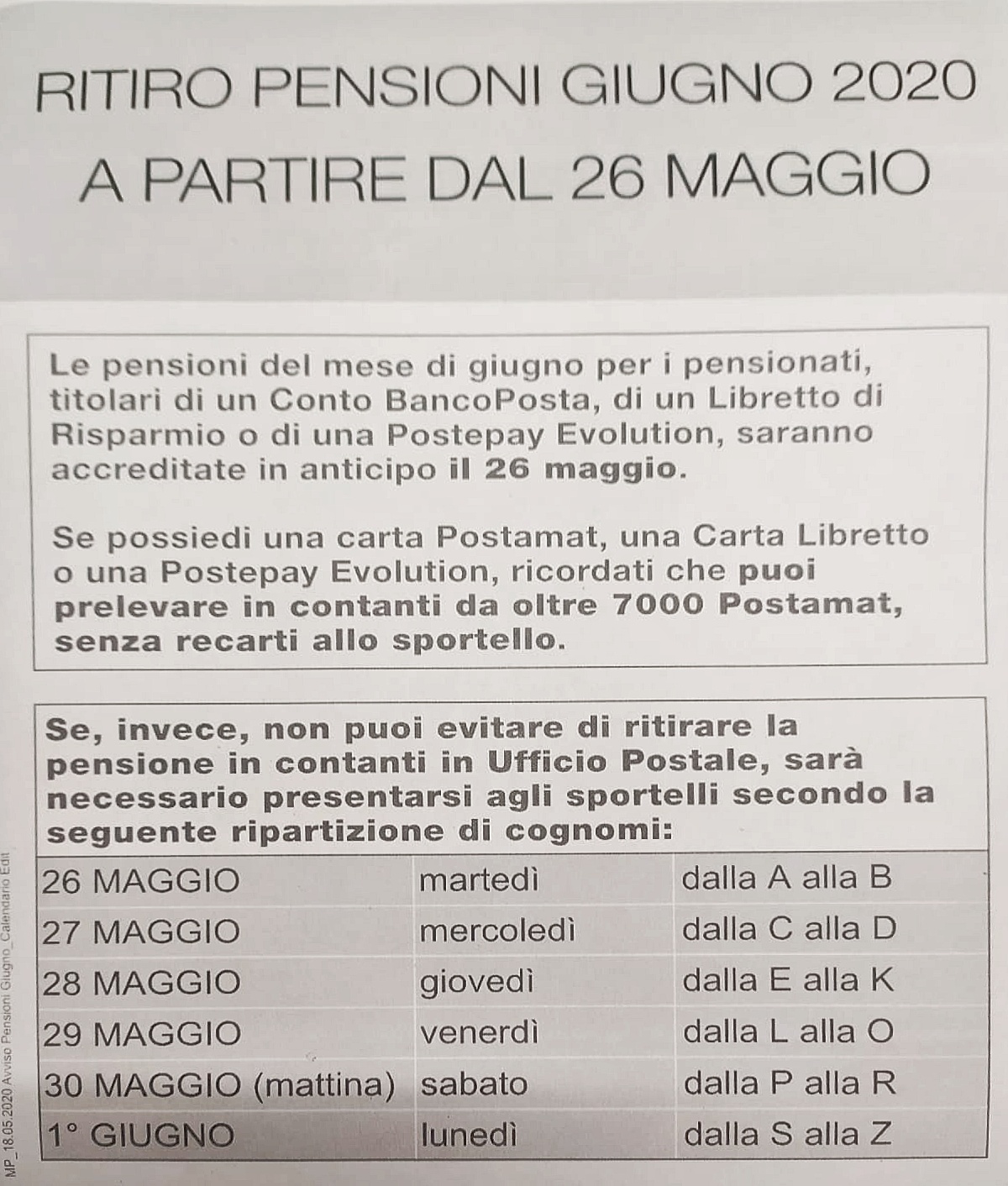 Nuove date ed orari per il ritiro delle pensioni presso l’Ufficio Postale di Posta Fibreno
