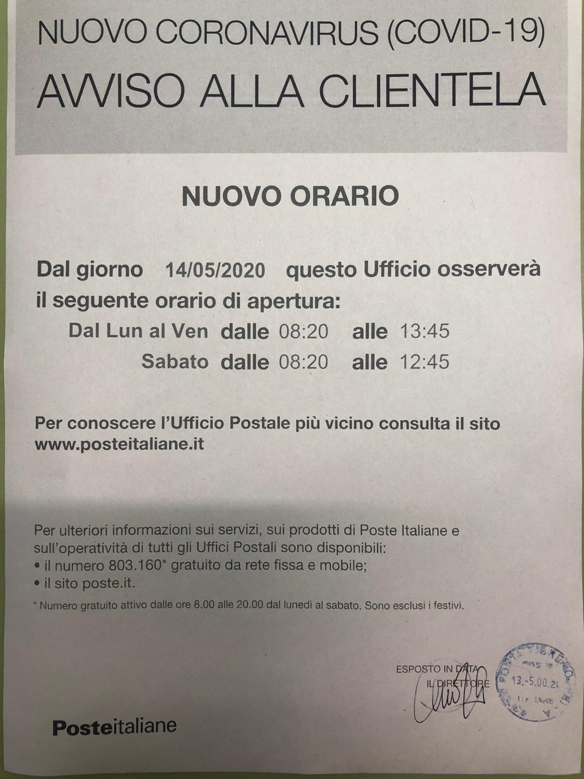 Nuovi Orari di Servizio dell’Ufficio Postale di Posta Fibreno