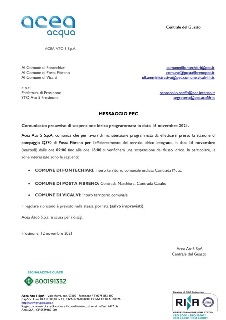 ‼️ Preavviso di sospensione idrica programmata in data 16 novembre 2021.